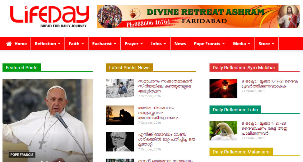 മലയാളത്തിലെ സമഗ്ര ക്രിസ്ത്യന് വെബ്സൈറ്റ്. അനുദിന സുവിശേഷ വായനകളുടെ ലഘുപ്രസംഗക്കുറിപ്പുകള്! വിശുദ്ധരുടെ ജീവചരിത്രം, ധ്യാനം, കത്തോലിക്കാ വാര്ത്തകള്, പാപ്പയുടെ പ്രസംഗങ്ങള്, പ്രാര്ത്ഥനകള്, വിശ്വാസ സംബന്ധമായ ചോദ്യങ്ങള്ക്കുള്ള ഉത്തരങ്ങള്, കുര്ബാന, അനുദിന പ്രാര്ത്ഥനകള്, ക്രിസ്ത്യന് സിനിമകള്, സംഗീതം തുടങ്ങി അനുദിന ആത്മീയജീവിതത്തിന് ആവശ്യമായതെല്ലാം.
