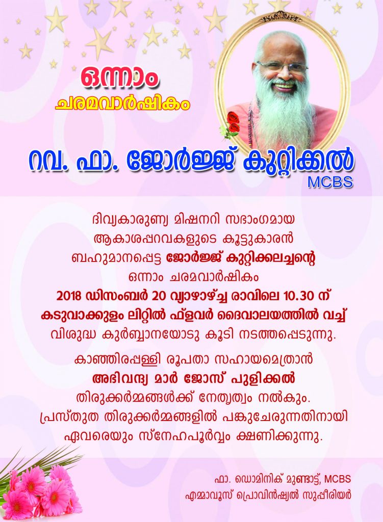 First Death Anniversary of Father George Kuttickal will take place at Little Flower Church, Kaduvakulam, Kottayam on 20th of December 2018 at 10.30 am. His Excellency Mar Jose Pulickal, Auxiliary Bishop of Kanjirapally, will be the main celebrant for the Eucharistic celebration. I invite all of you to join and pray for the repose of the soul of Father George Kuttickal on the occasion.