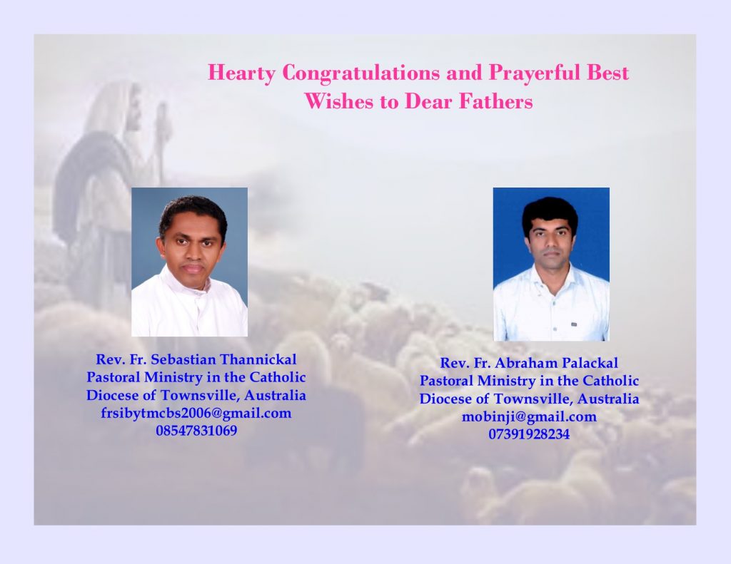 Hearty Congratulations and Prayerful Best Wishes to Dear Fathers Sebastian Thannickal and Abraham Palackal who are leaving for pastoral Ministry in the Catholic diocese of Townsville, Australia.