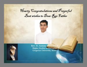 Hearty congratulations and prayerful Best Wishes to Rev. Fr. Antony Tholanickal who begins higher studies in Philosophy in Gregorian University, Rome.